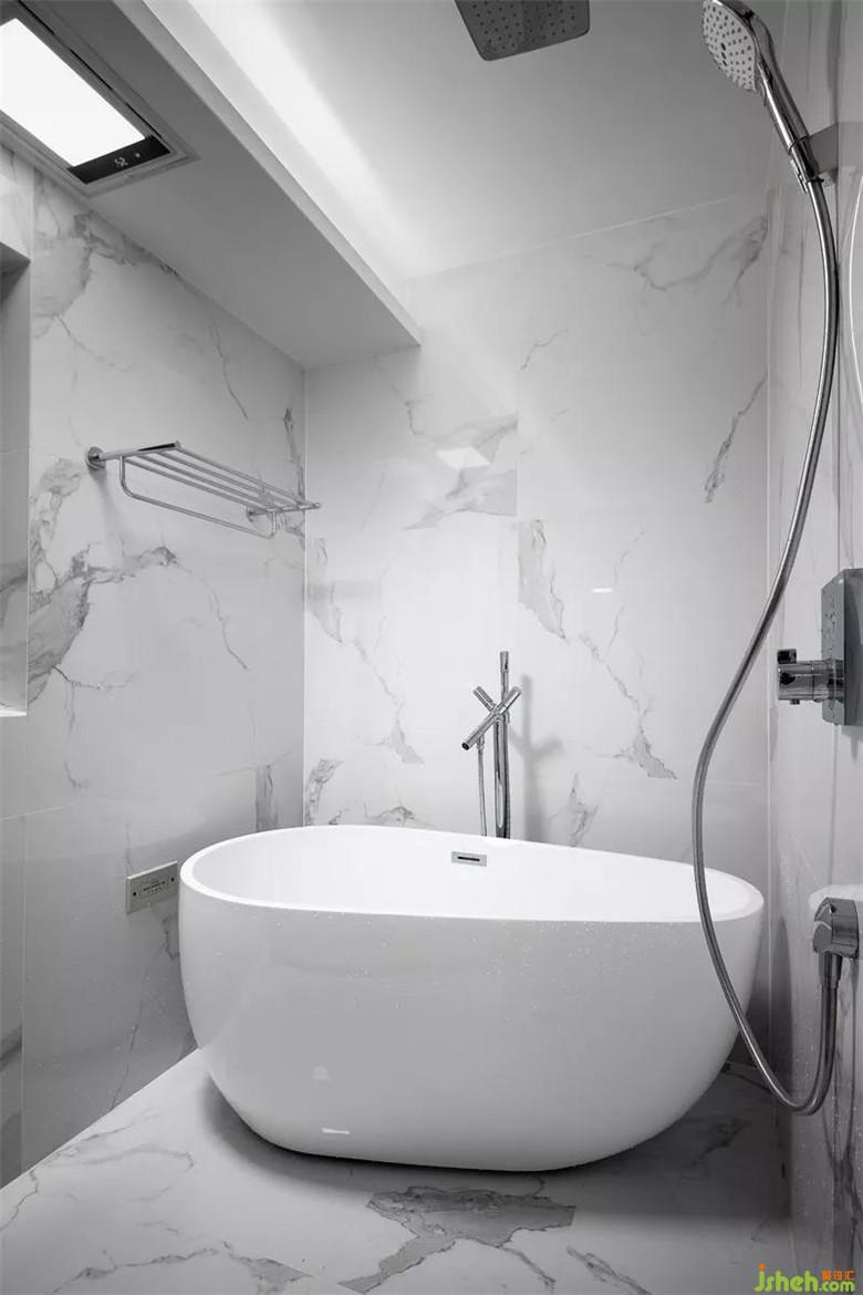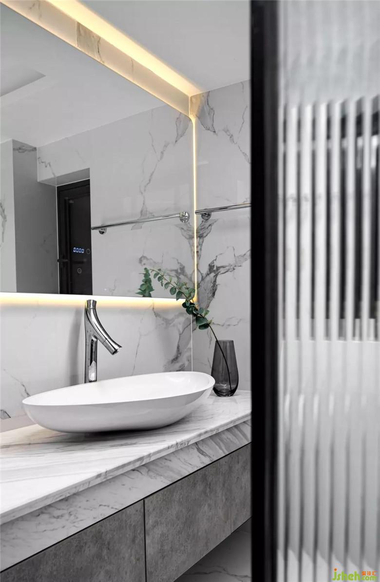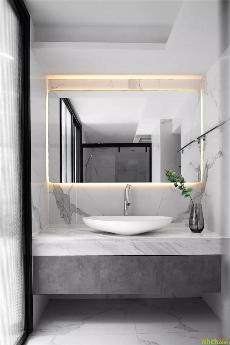 宁静斑驳的爵士白大砖,勾勒出符合居住者私密场域。 镜柜四周特别用了暖色调的灯带,温暖如初。