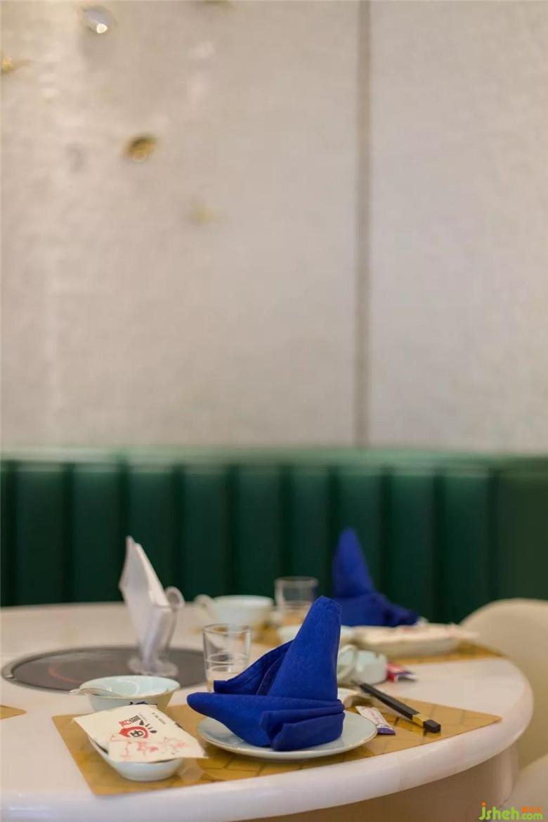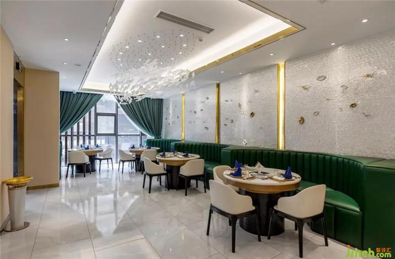 天然祖母绿作为卡座区的主色调,这一白色与绿色的混合体,蕴含明晰的纯粹之感,更具有视觉上的冲击力。绿色亦契合本案饮食的自然新鲜理念,屋顶上晶莹剔透的鱼儿,以活泼灵动的象征意义赋予场景空间新的生命力。