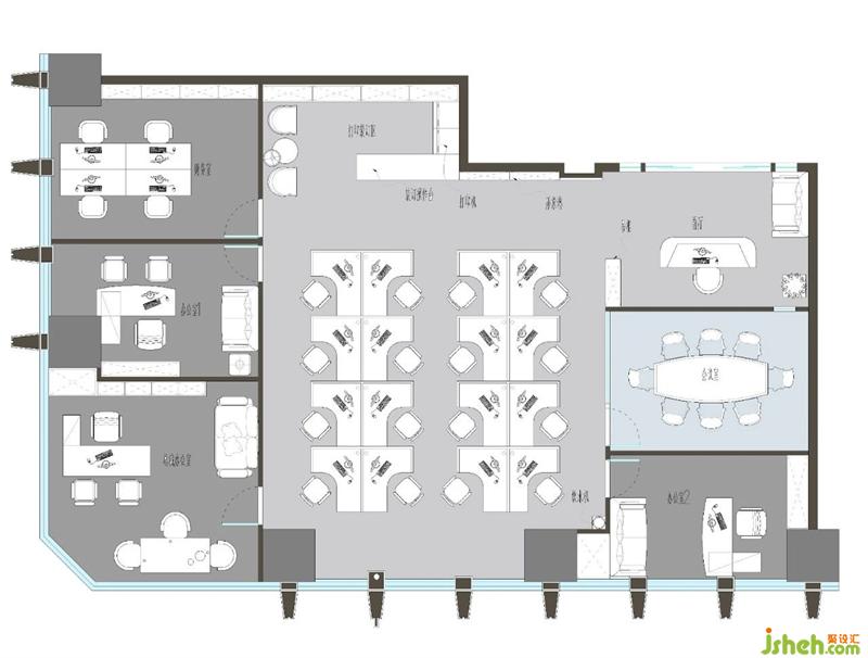 根据客户需求,将原始户型重新布局,规划出了独立办公室、公共办公区、财务室、会议室、打印装订区、休息区。本案中大量使用了白色乳胶漆、部分使用灰色及蓝色色调乳胶漆,让整个办公空间尽显干净简约。无窗会议室采用大面积落地玻璃与百叶窗,增加采光的同时也保证了私密性。