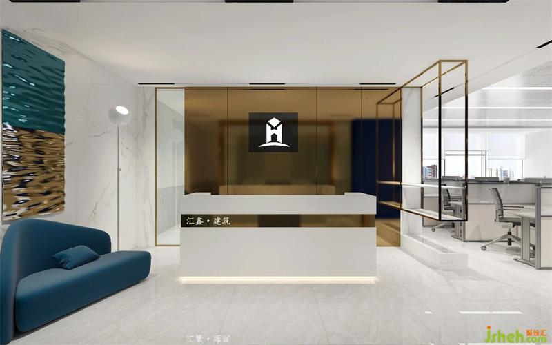 由金色板面拼接而成的接待台背景墙面,配合嵌入式射灯,在光影、线条的的交织下形成了富有变化的表面。灰色水泥地砖、爵士白墙面、烤漆黄铜条、宝蓝色丝绒材质的沙发配合使用,以切割和悬挑的方式,含蓄又不失变化。