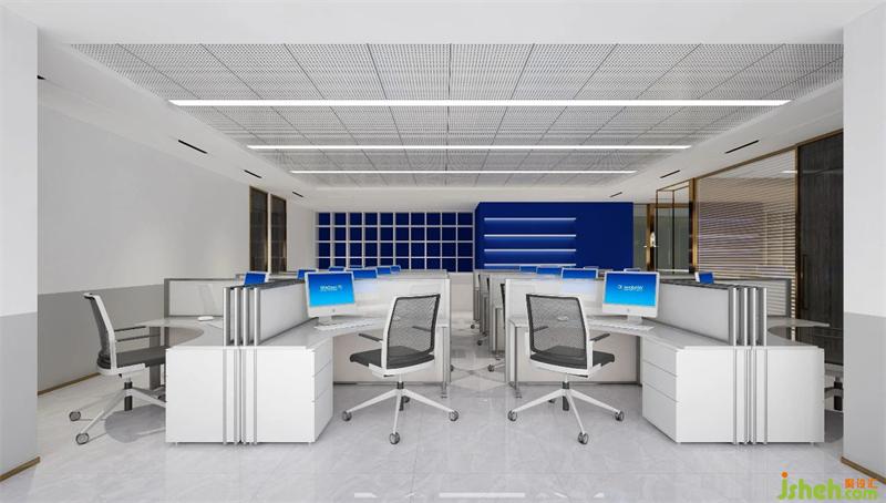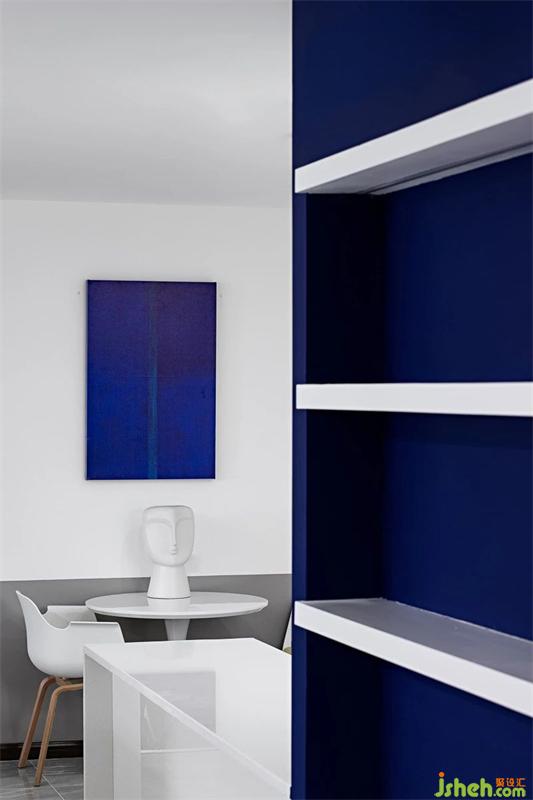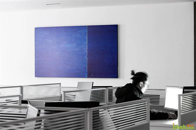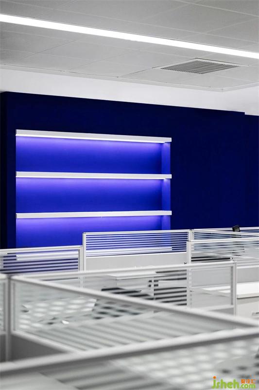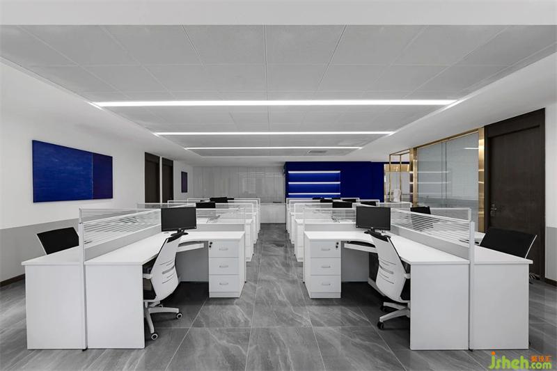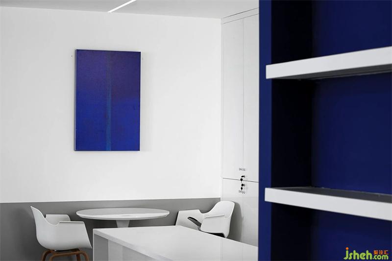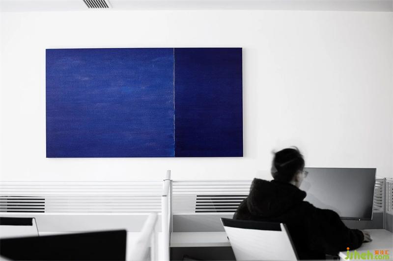 设计师在进行动线推演后,以田字形贯穿整个空间,丰富使用动线,大家在这里自由的协作、交流和沟通。天花板吊顶的几何蜂窝状,延展了空间的呼吸感,左右联通的一体式柔和灯带,满足办公室灯光环境对人的情绪和心理感受,达到空间使用与观感的平衡。与朴素配色形成对比的宝蓝色系,办公室设计以挂画、墙面的形式点缀局部,既激发着身处该空间的使用者的创造力,催化着思维方式的自由与发散,又起到突出空间的作用。