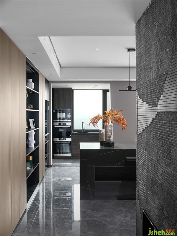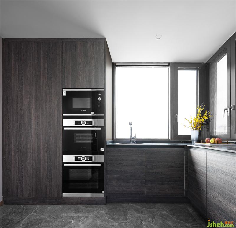 女主人对厨房的使用频率高,因此我们设计了中西厨。墙地面运用大量灰色色阶的材质,如层次分明的大尺寸地砖、带有纹理的灰黑色橱柜以及黑色的大理石台面,返璞归真的色调,流露自然美感。