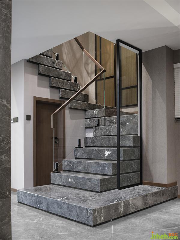 原户型楼梯狭小,加宽加大后,挑高的楼梯给人感觉更加舒服。阿波罗灰大理石的阶梯,无接缝的表面使其令人感觉宽敞,透明的玻璃扶手和工业外观彰显理性色彩。