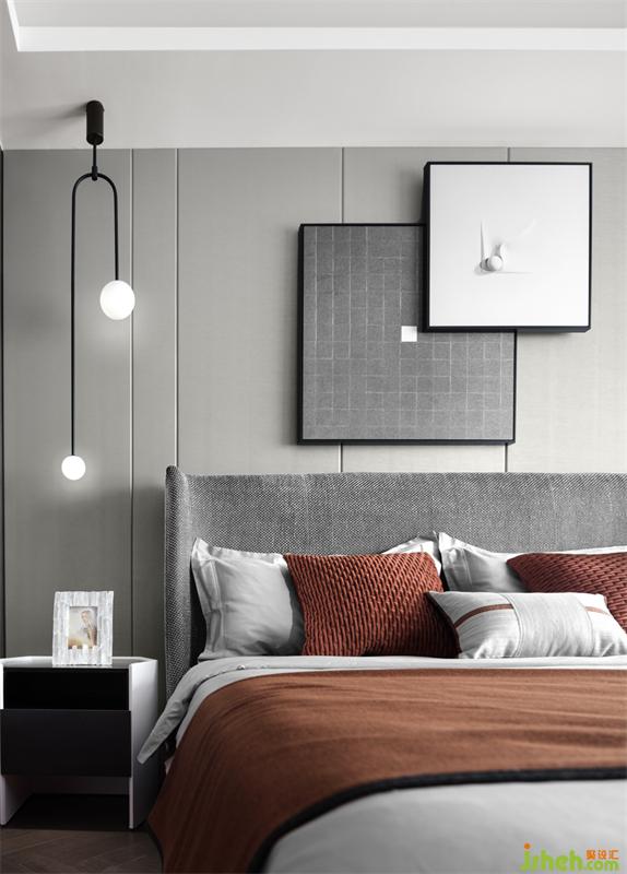 兼顾居者的个体差异性,以简单、细腻、素雅为基调,赋予卧室独特的个性。主卧无主灯,而是采用一边线性灯,一边台灯的不对称布置,与床头一大一小的立体复古画完美融合。