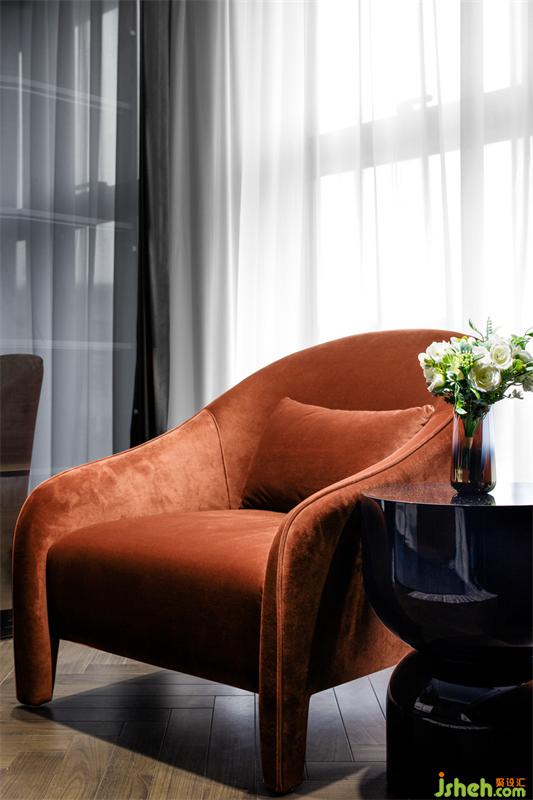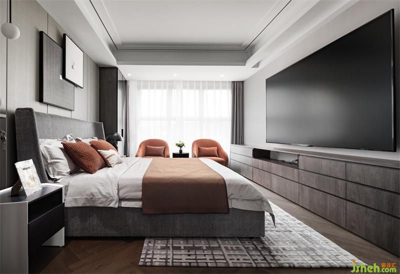 焦糖色的单椅与床品搭配相得益彰,增加空间的层次感和趣味性。超大屏的电视,满足业主投屏看电影的习惯。