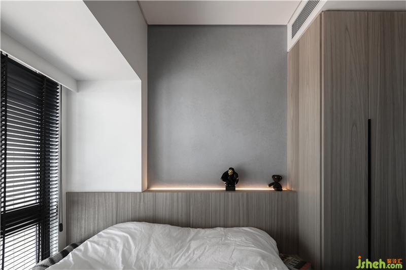 次卧榻榻米的床头暗藏灯带,墙面刷了灰色乳胶漆,床头边上是木质衣柜,为工人现场制作安装。