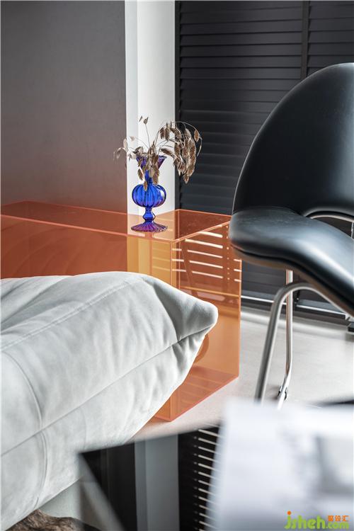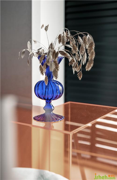 图为客厅边几上的透明蓝色花瓶
