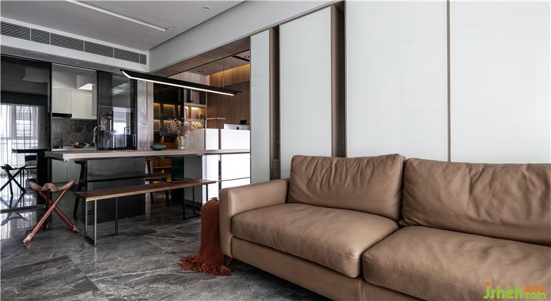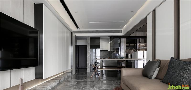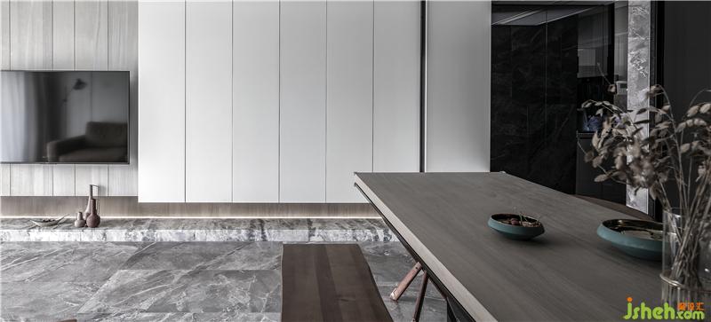 客厅电视背景墙为一整面的储物柜,柜面为白色烤漆,在吊柜的两边都有黑色不锈钢作为见光板,深圳室内设计师以此作为两个材质中间的界限。空间延申感十足,使得空间更加通透,使得整面墙干净整洁。在电视底部背景使用了浅色木饰面,把线路以及网络线全部隐藏在背景内部,下方地台为大理石,在里面一整条的灯带用以勾勒形状以及渲染氛围,悬空的地方可以放置一些小摆件,背景为较深一些的木饰面。在简简单单的一面电视背景墙上是有着三种材质背景,使得电视墙的层次感丰富起来了。