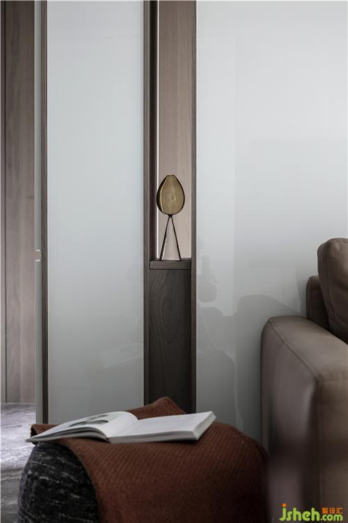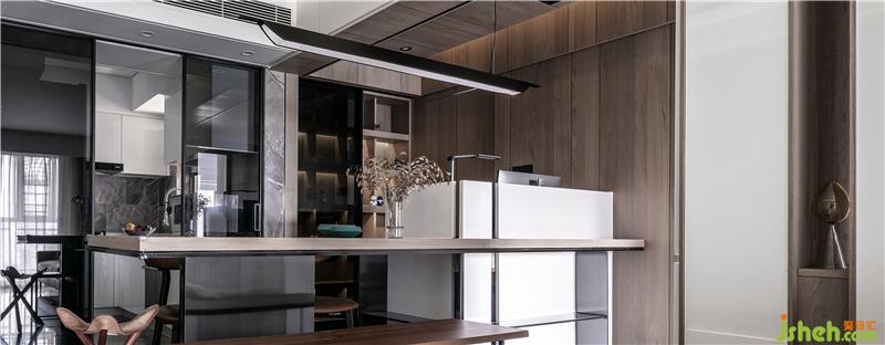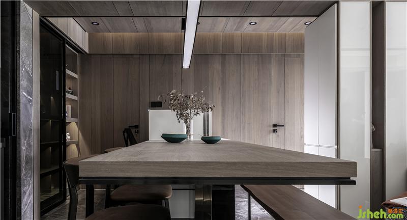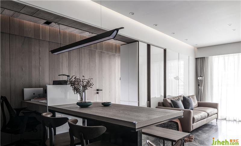 餐厅的整体背景为木色,一整面的木饰面,做了隐形门的设计,避免了过道小区域的空间碎片化,将次卧的门以及卫生间的门很好的隐藏起来了。在餐桌旁边是书桌,以白色的高挡边区分开两个分区。在书桌后面是一整面的书柜,是实木层板与深色玻璃组成,柜体材质为实木,推拉玻璃门给人很强的高级感,为空间带来宽敞的通透质感,采用的是一门到顶的设计。