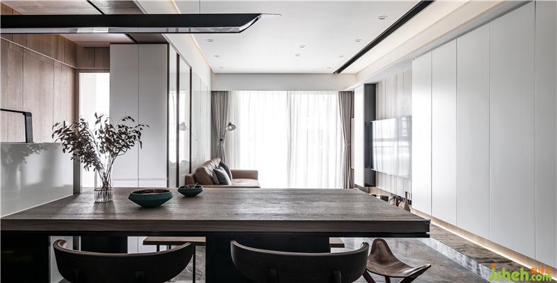 沙发背景墙为白色玻璃,中间为木色层板,可以摆放小摆件饰品。最边上单列的储物柜的柜门朝向餐桌方向,往里的中间部分的柜子开门方在背面,深圳室内设计师以此让沙发背景墙显得有层次,白色与木色的配合,让空间显得十分有质感。