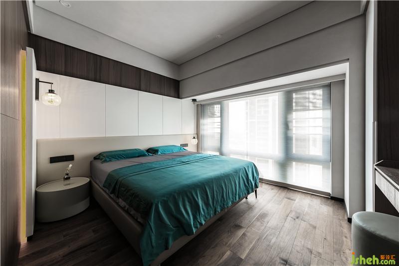 硬包造型藏有一圈灯带,让空间更有温馨的氛围感。窗户那面墙刷白,落地窗和日夜帘的搭配是居家必备。地板为木地板,整体色调为木色,加以白色点缀。