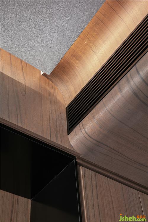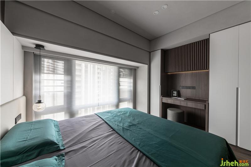 次卧的床的对面为一整排衣柜,柜体为木色,柜门为白色烤漆柜门,无拉手设计。中间部分为梳妆台,也可以作为书桌使用。衣柜与梳妆台为一体。吊柜柜门做木格栅造型,下面暗藏灯带。