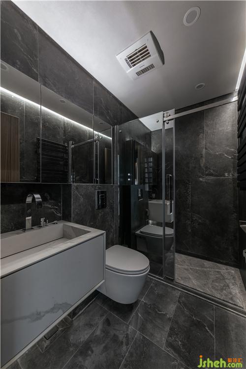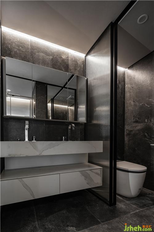 卫生间做了干湿分离,采用的是镜柜,集收纳、实用、美观于一体,台盆深一些防止溅水,浴室柜材质为大理石纹路的白色岩板。墙面、地面为.三分之一工字铺的黑色地砖。