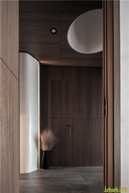 隐形门设计将门融入了背景里,搭配灰色仿岩板地砖,整体色调相统一。