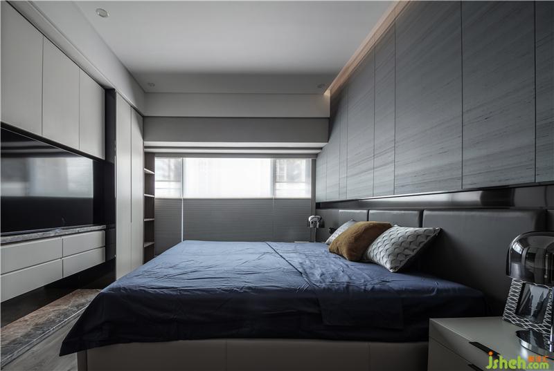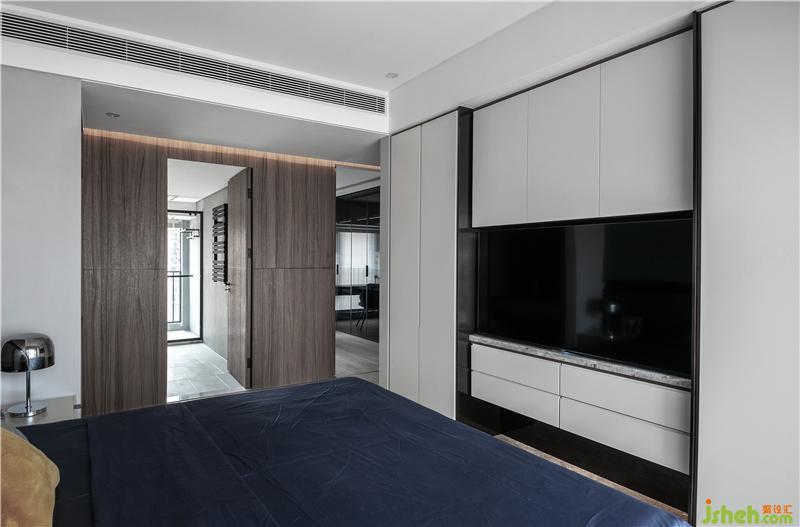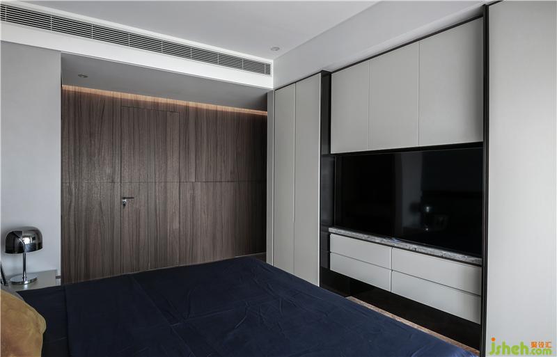 主卧的电视背景墙为一排白色烤漆板的柜子,增加了收纳空间。