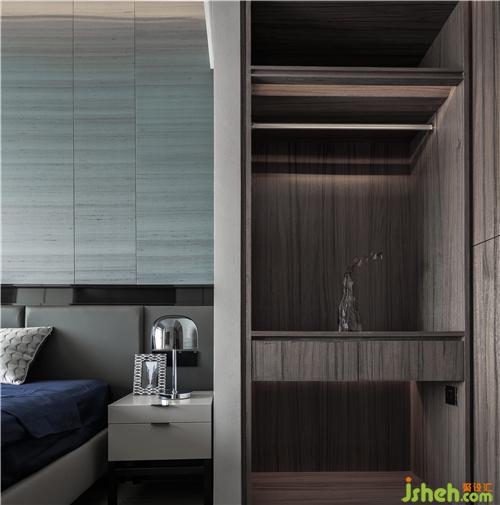 床头一侧设置了开放式的木饰面的衣柜,用来平时业主挂衣或者是一些物品收纳。