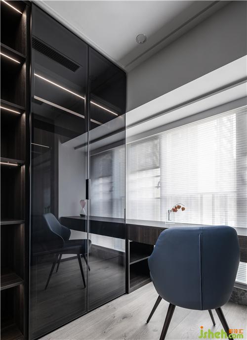 Owners like blue, and require that the bigger the bed, the better. We use dark gray tone with wood floor, paved with light to create atmosphere, dark bedroom can let people into sleep state. The soft package and hard package of the background wall at the head of the bed are combined with the stainless steel in the middle. It reveals a sense of delicacy.