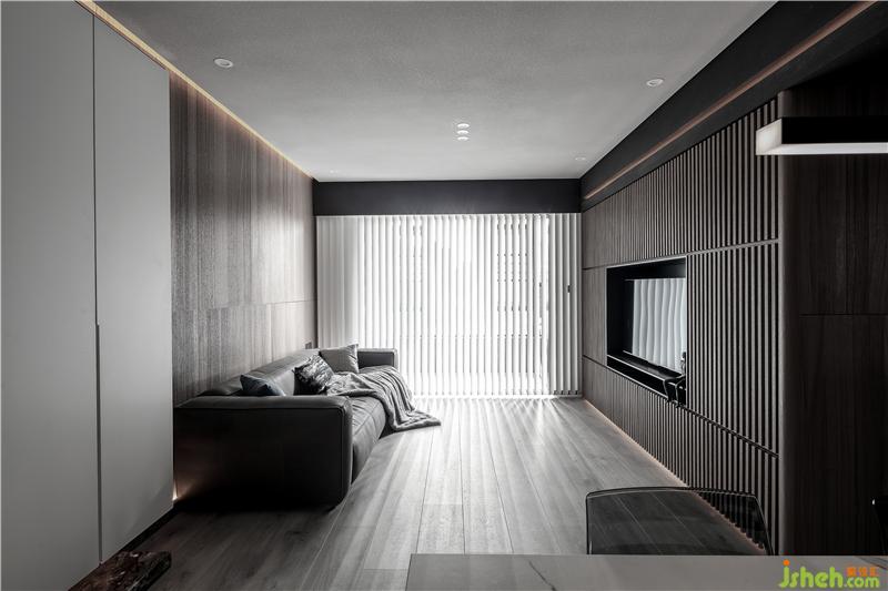 设计上大面积选用浅木色调,以明度、亮度较高的色调进行点缀,让空间有静有动,适宜舒服。客厅做简单的吊顶,并采用无主灯的设计,空间看上去显得大气。业主偏爱简约色调,以木色为空间主调,再搭配白色和金属色,增添暖意。电视背景为一整面墙的木制储物柜,柜门的造型为木格栅,电视被一圈黑色不锈钢包围,黑色不锈钢层板与木制储物柜相得益彰。在储物柜下方藏有灯带,在储物柜上方的天花也藏有灯带,上下呼应。