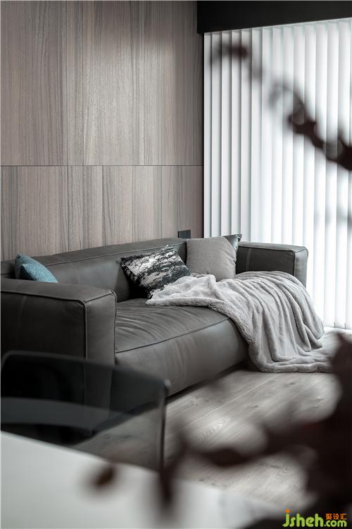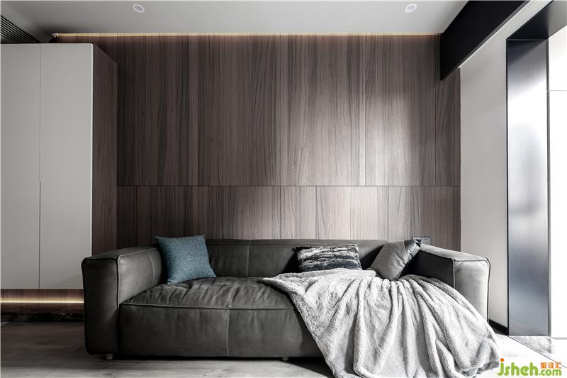 电视及沙发背景墙和地面则采用了不同深浅的木色,奠定了整个空间低调优雅的基调。皮质沙发打破了客厅的沉寂,生动又俏皮。软装加入了灰蓝色、米白色、灰色的点缀,增加了空间的灵动、宁静感也丰富了层次。在沙发上方的天花也藏有灯带,地台上方也藏有灯带,在弥补自然采光的同时,提升空间的立体感。