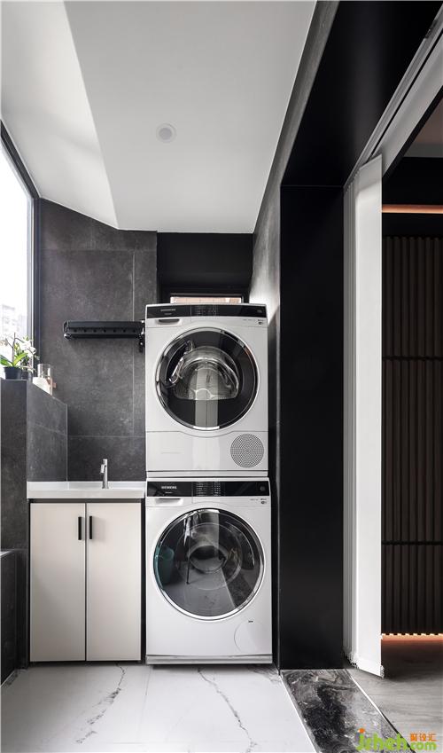 将洗衣机安置在阳台,减少使用时对屋内的影响,定制储物柜将洗衣机嵌入其中,将收纳进行到底。阳台地面铺贴白色大理石的地板砖,结实耐用且便于打理。