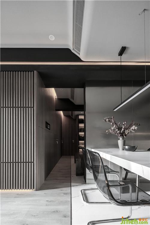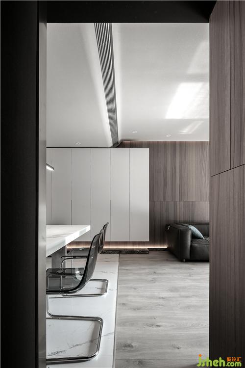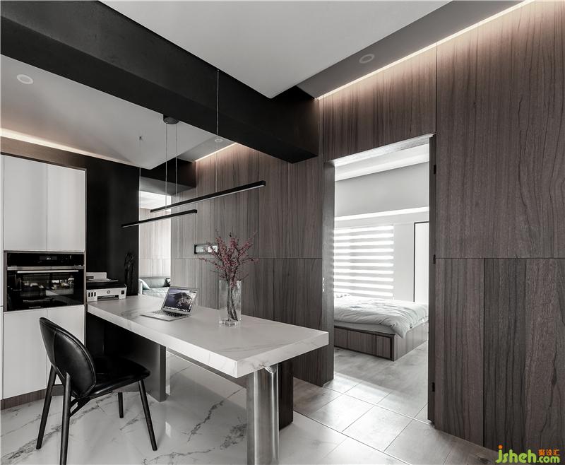 多功能区的桌子与餐厅相同,大理石台面与不锈钢交相辉映,为空间注入了一丝硬朗。