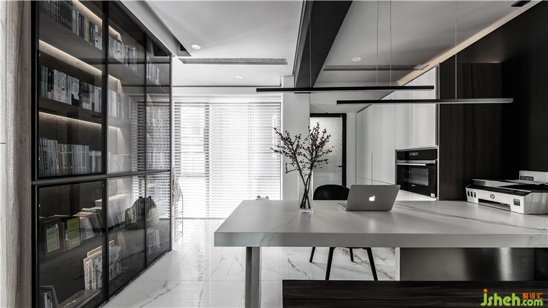 多功能室的书柜运用玻璃推拉门,百叶窗让充足采光穿透到客餐厅。整个空间采用黑白+木色为色调,营造出最干净温和的视觉观感。半开放式的多功能室是对空间“关系”的思考,互通性与私密性共生。黑色的线条流动其中,用线条构建简洁的利落感。