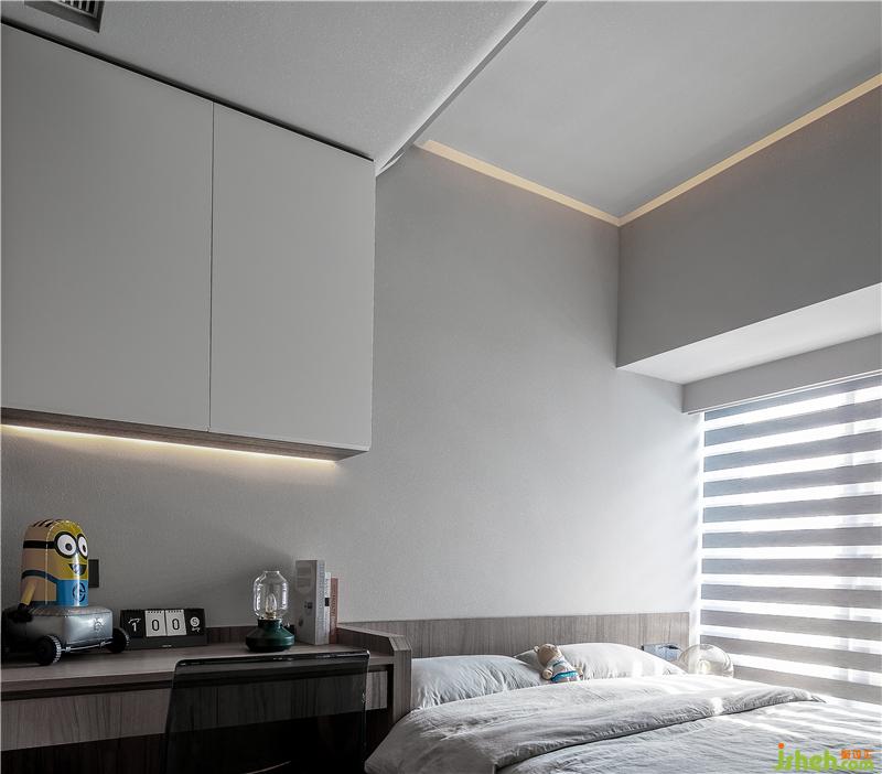 次卧的收纳空间做得也是非常充足的。白色烤漆吊柜与白色墙面交织成一幅线条感强且立体的画面,深圳装修设计视觉上更简洁、统一。