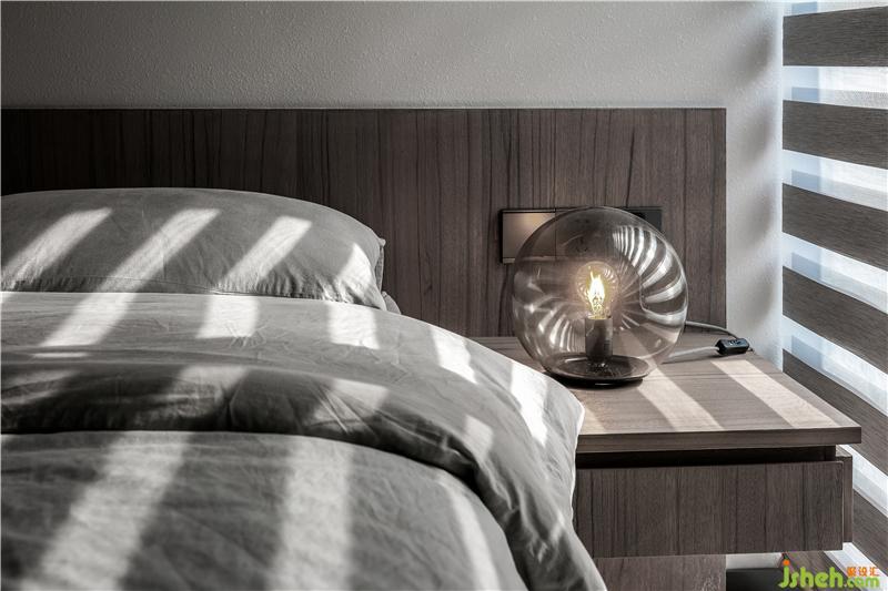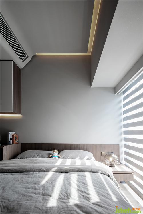 次卧部分墙面选用了浅灰色调的漆面,避免了全白墙面的单调,同时与床头融为一体,有种由外而内的延伸感。