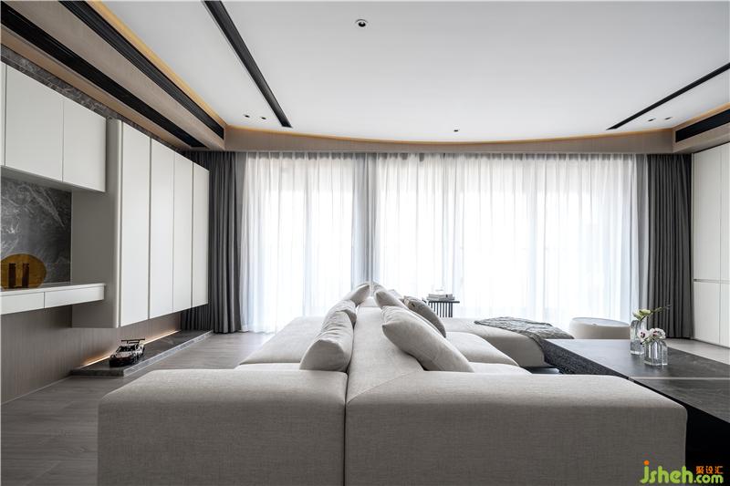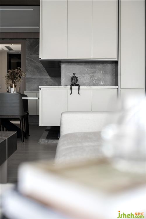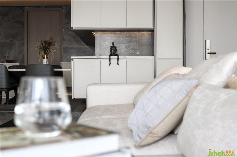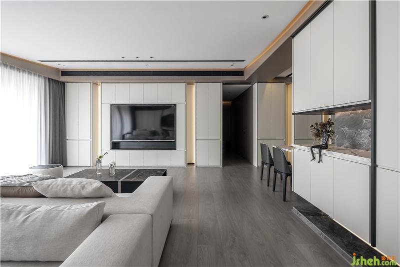 大面积用了米白色烤漆柜门,空间干净利落,造型上遵循了减法原理,增加了公区的收纳性,电视柜和酒柜的材质和颜色统一,在画面上形成整体,双面沙发的设计增加了各个空间的互动和对话。