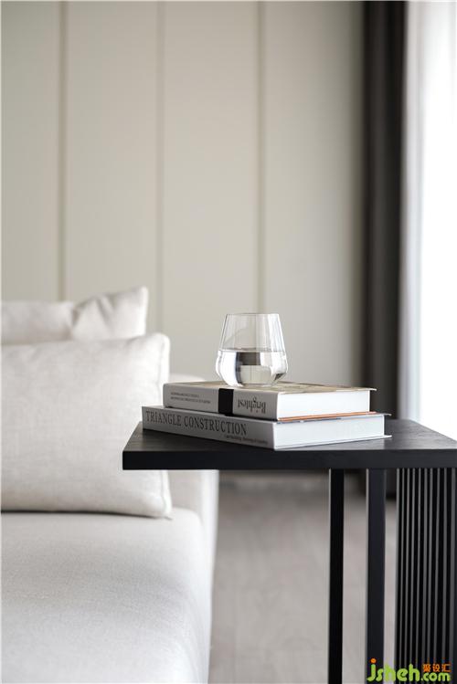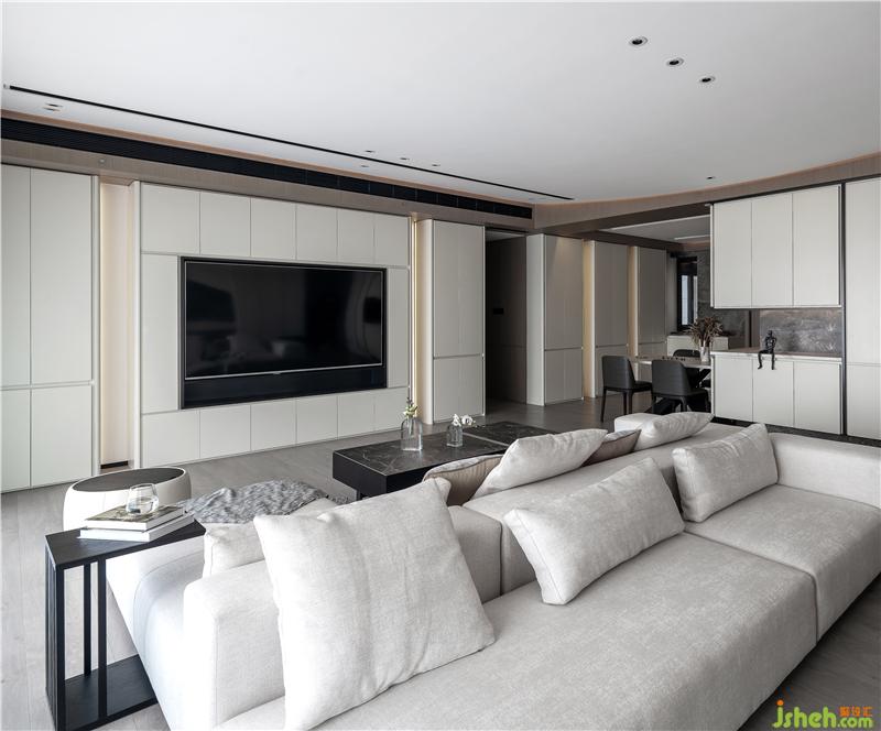 客厅主色调是白灰色,电视墙的设计内凹了两条光,削减了体量,使风口与背景墙的结构更平衡,空间的留白是至关重要的,未来可以有更多的可能性。