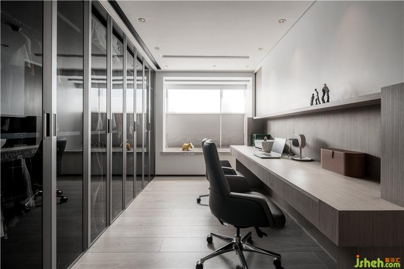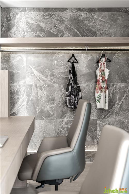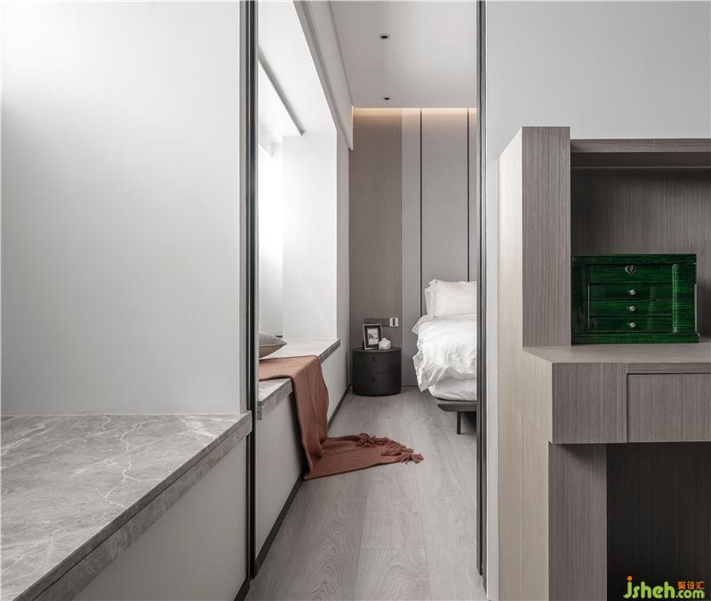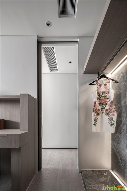 衣帽间在主卧内,利用书桌结构设置了隐形门,形成环形动线,隐形门关起来画面是整体性的,打开之后可以互相对话。