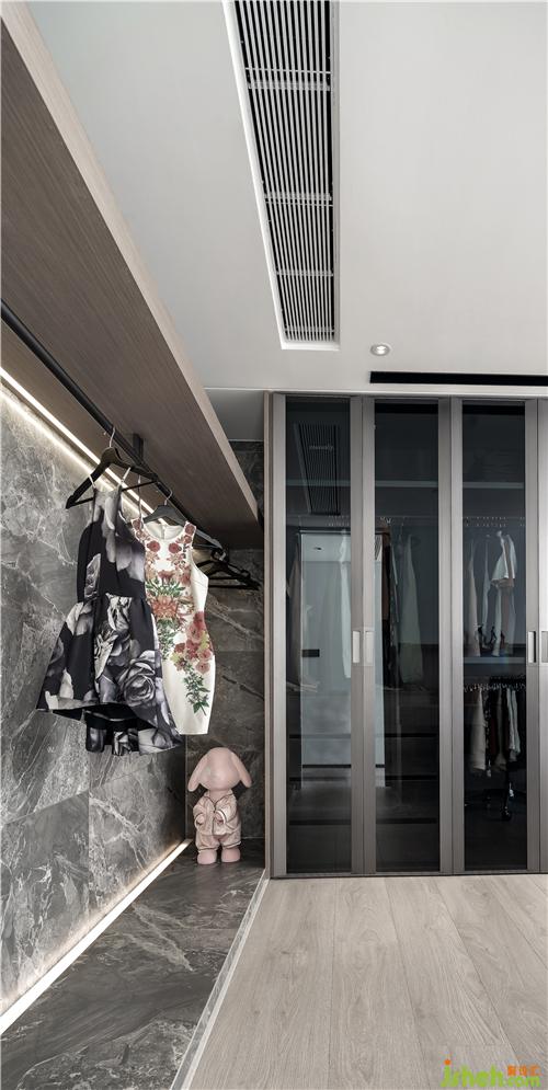 衣帽间采用开放格与封闭柜门结合的方式,满足客户对于不同衣物的收纳,加入线性灯更加便于衣物的拿放。