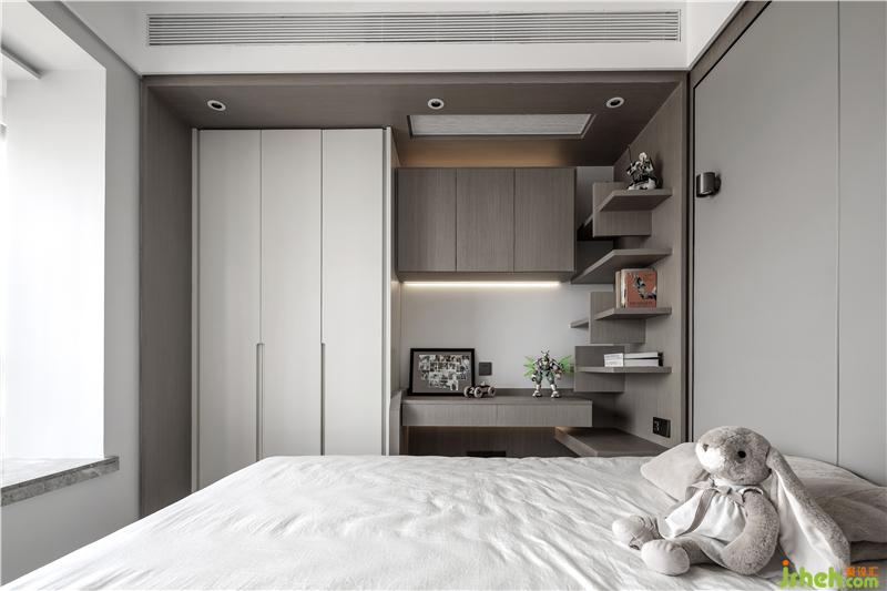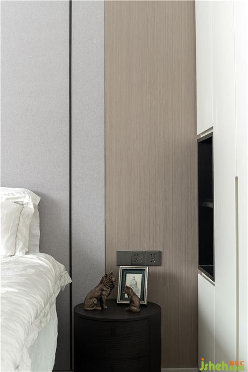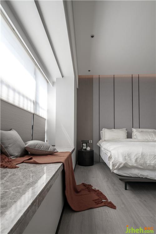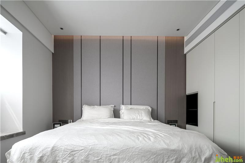 灰蓝色的床头背景搭配干净明朗的床品,极简的落地灯通过墙体反射光照明,光线更柔和,深圳装修设计营造一个温馨的睡眠空间。