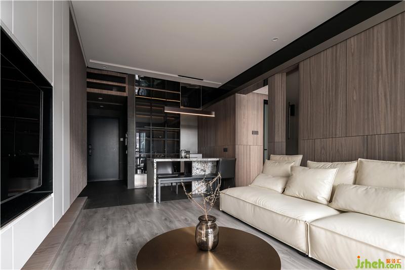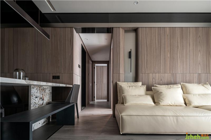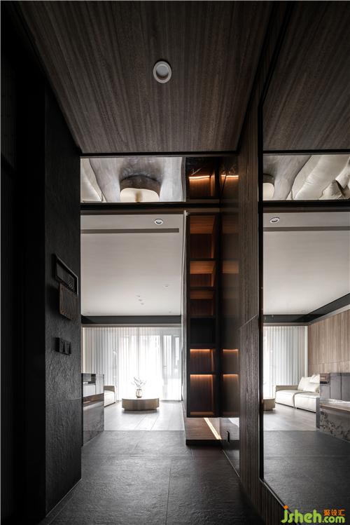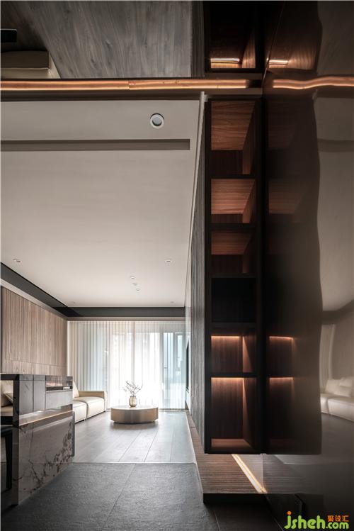 入户即玄关,紧靠原户型的左边的承重墙前设计了入户全身镜,然后顶天立地的玄关柜,深圳中空和下方地台满足进门随手放钥匙和鞋子的习惯。做了灯光装修设计避开了直视灯光,减少了灯光污染,顶天立地的木格珊柜门的鞋柜,隐藏柜门的设计让柜子画面干净且不抢视线。