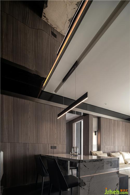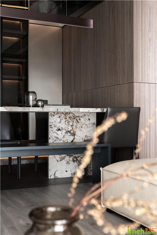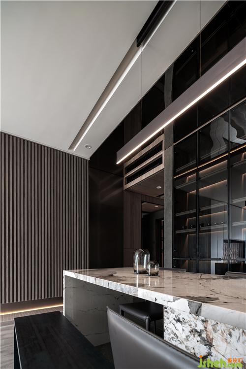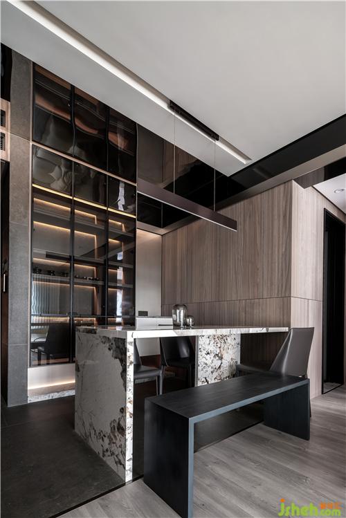原本的厨房门这边做了镂空的展示柜和开放操作台,开放的操作台下面可以放一些杂物提供给餐桌使用,业主在生活中发现的美丽摆件和收藏的酒和茶,可以展示在透明的玻璃柜里,看到心情也是极好的。