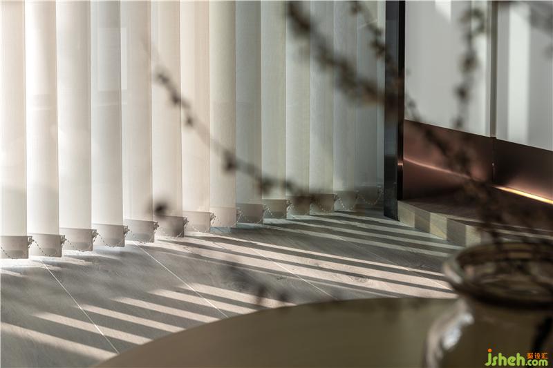 衣帽间看向主卧,衣帽间收纳让业主自由惬意的面对生活中各种场合衣物分类需求。