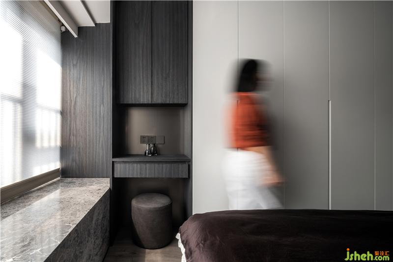 进入主卧房,与房门相邻的衣柜做了一个隐藏门封闭式的衣帽间,隔绝粉尘的同时也彰显女主人生活的格调。
