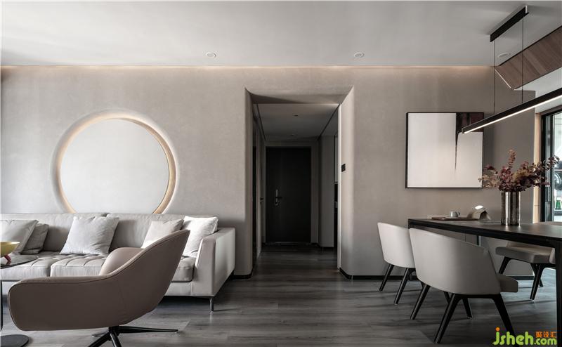 沙发背景和餐桌背景选择了统一的浅色的涂料,不喧宾夺主的同时增加了空间协调,同时沙发背景圆形造型和餐桌正方形简约挂画,一圆展示家庭温馨的感受,一方给予人克制感,让业主居住空间张弛有度。