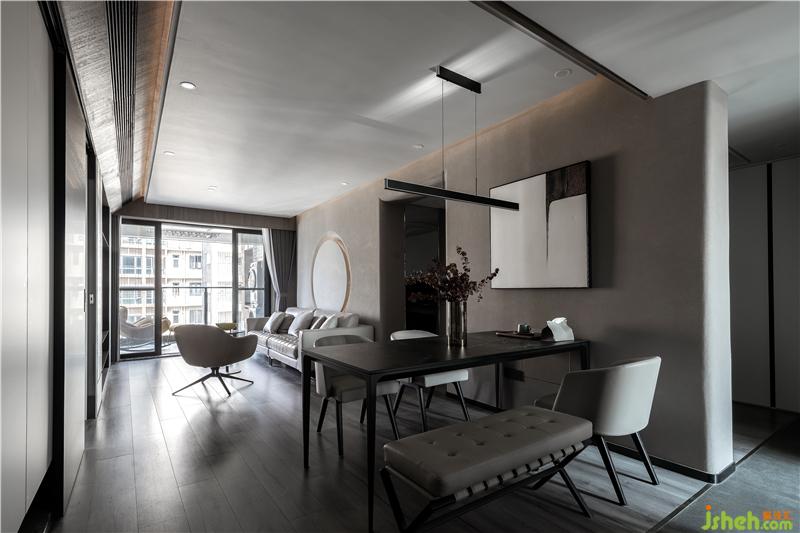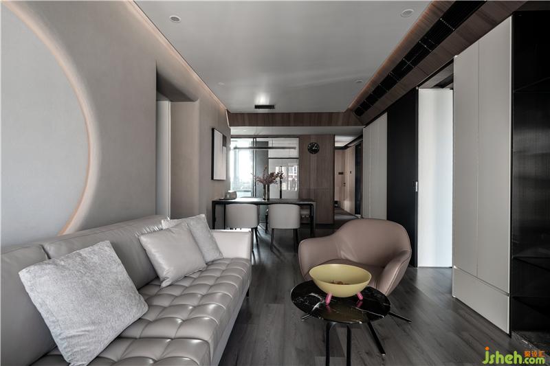 利用过道动线,把客厅一分为二,一边会客空间,另一边是餐厅空间。让整个空间区分开来,却做好空间区分,也让整个客厅空间放大的效果。