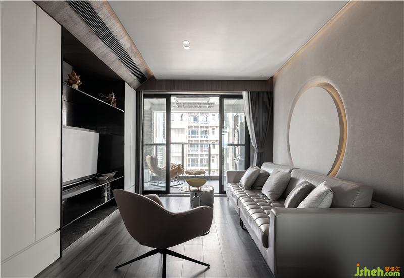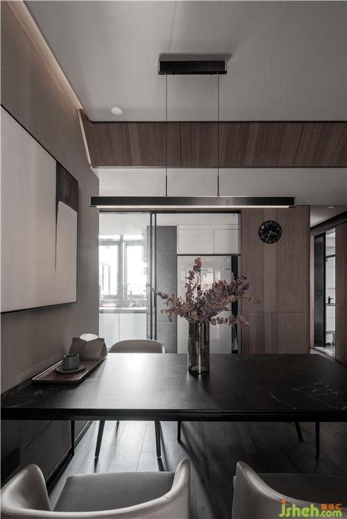 餐厅和客厅之间有个黑色的推拉门和电视背景黑色开放柜形成呼应的同时,增加了门后卧室空间的私密性,保留了女主人自己的办公空间不受打扰。