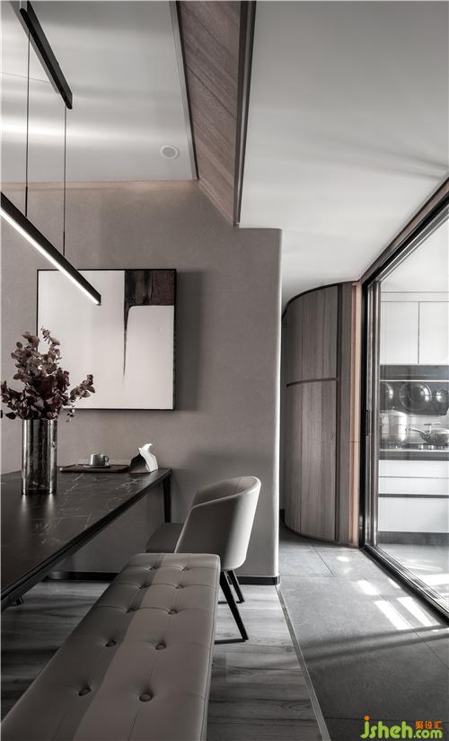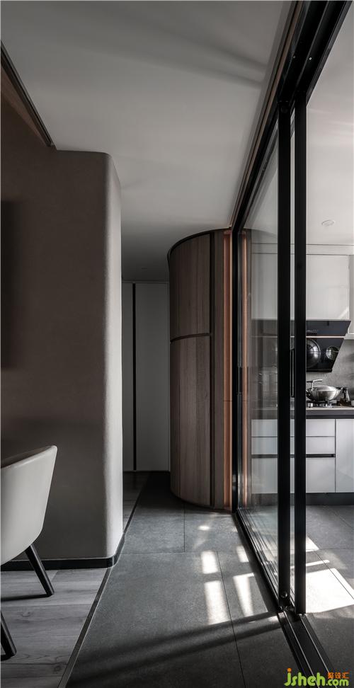 业主的父母会在靠近餐厅旁的中厨,进行一日三餐的制作,中厨过道的动线直接连接玄关鞋柜,此间转角的设计成圆弧形,让孩子在家庭穿梭的空间多一些保护性,增加了空间柔软包容感。让我们的设计理念得以释放,设计源于生活,也融入生活。