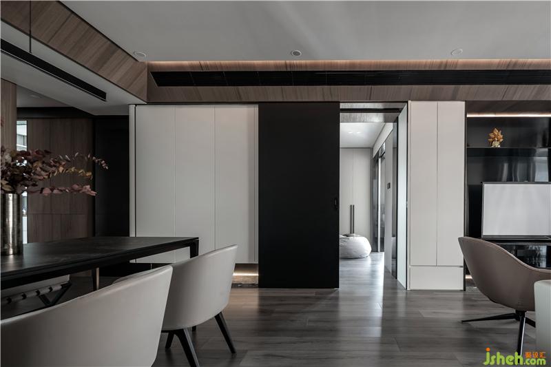 客餐厅通向主卧,推拉门可以隔绝业主在家也能办公的自由。