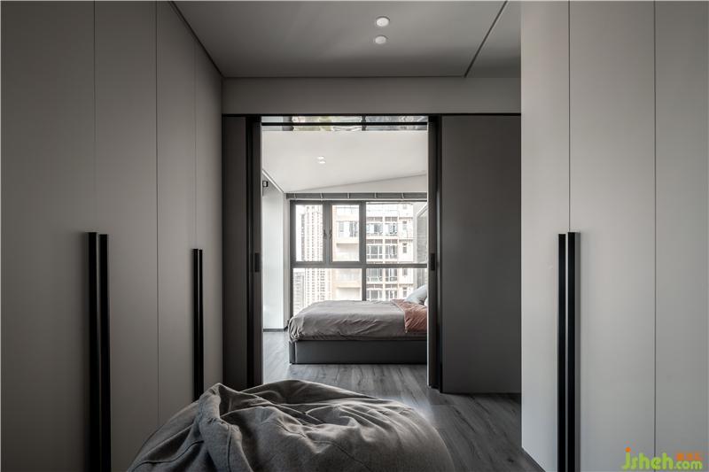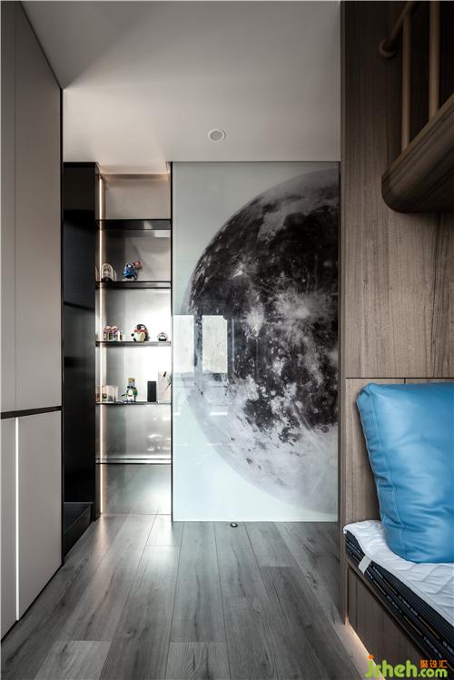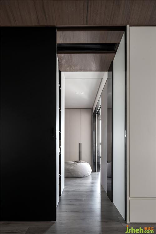 卧室是吊轨式的,这种工艺需要在前期天花设计时预留轨道槽,深圳装修设计地面不用安装轨道,解决了传统推拉门轨道清洁的痛点。