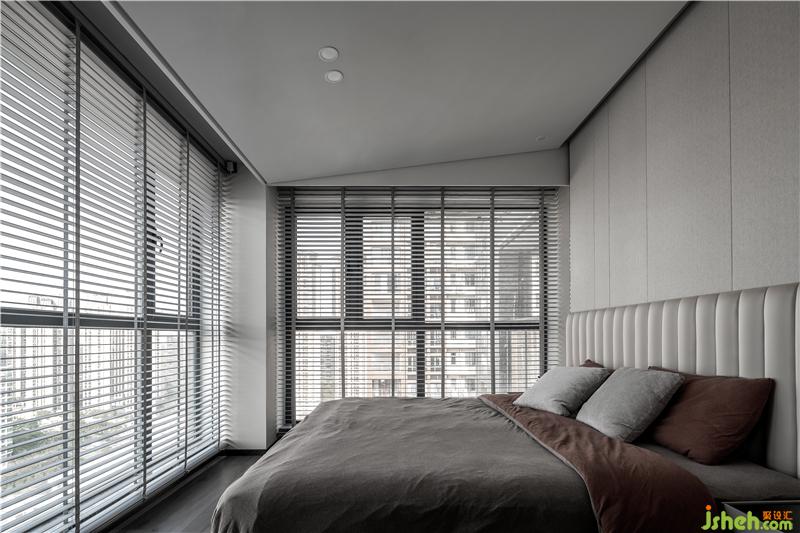 卧室两面的落地窗,让空间通透明亮,同时天花做成谢顶,延伸的线条,放大空间的视觉感。