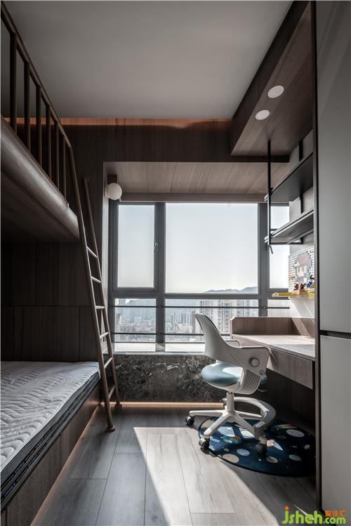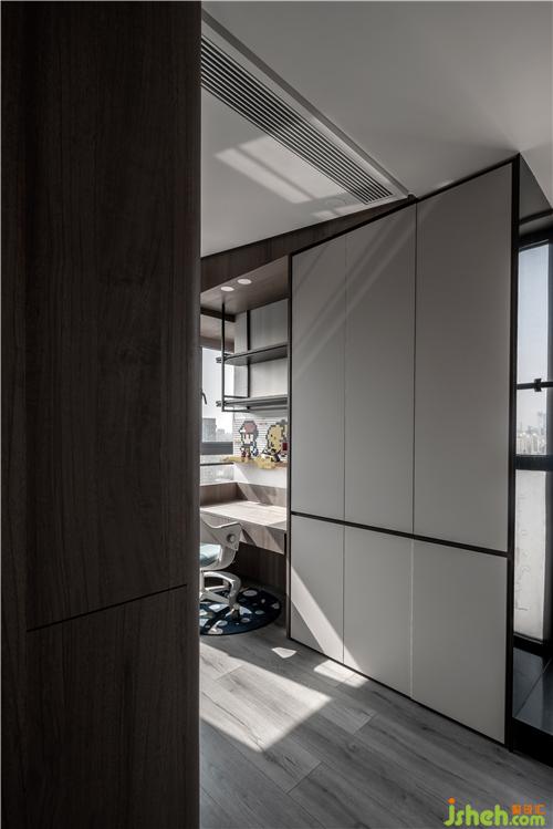 卧室两面的储物空间,极大满足业主储存需求,靠近墙边的办公桌嵌入顶天立地的柜子旁边。深圳装修设计增加实用性的同时不浪费空间。对面的主卫用墙面一样颜色的木色,和墙融为一体,减少卫生间的突兀。和空间和谐共生。