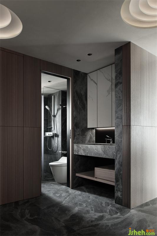 卫生间大面积运用大理石搭配黑钢的设计,在整理保持美感的同时降低维护陈列感,利用光影镜面放大空间格局,视觉感开阔自由。