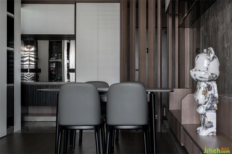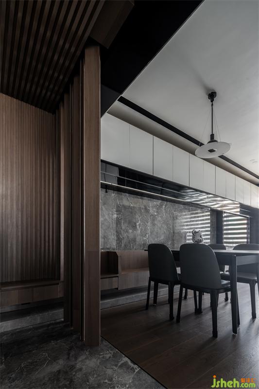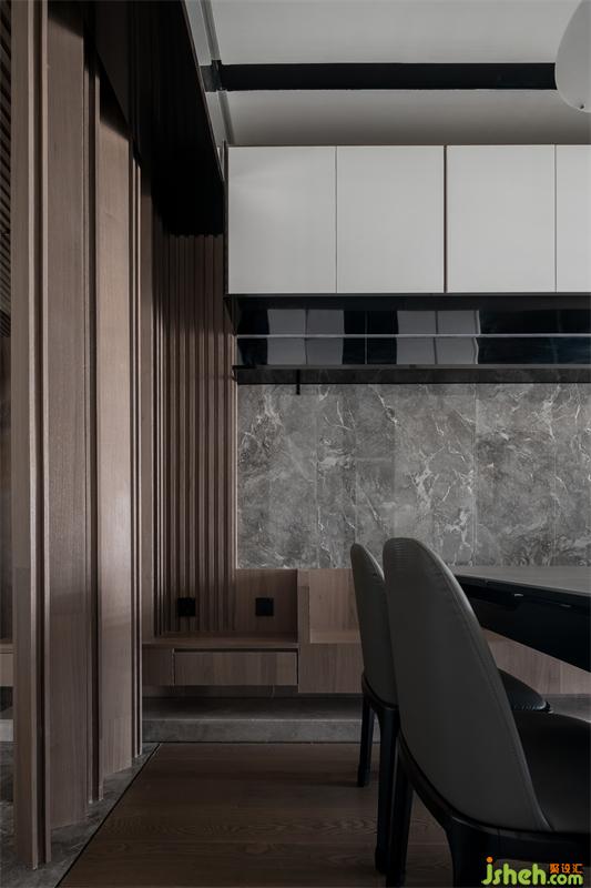 美感与实用完美结合;岩板、木质、黑钢的材质相互中和