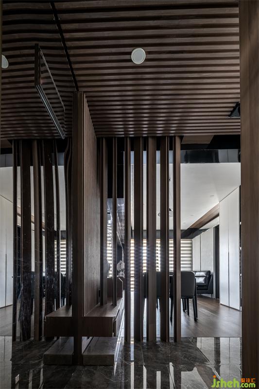 进入玄关,木格珊错落立在餐厅旁边作为客厅的屏风