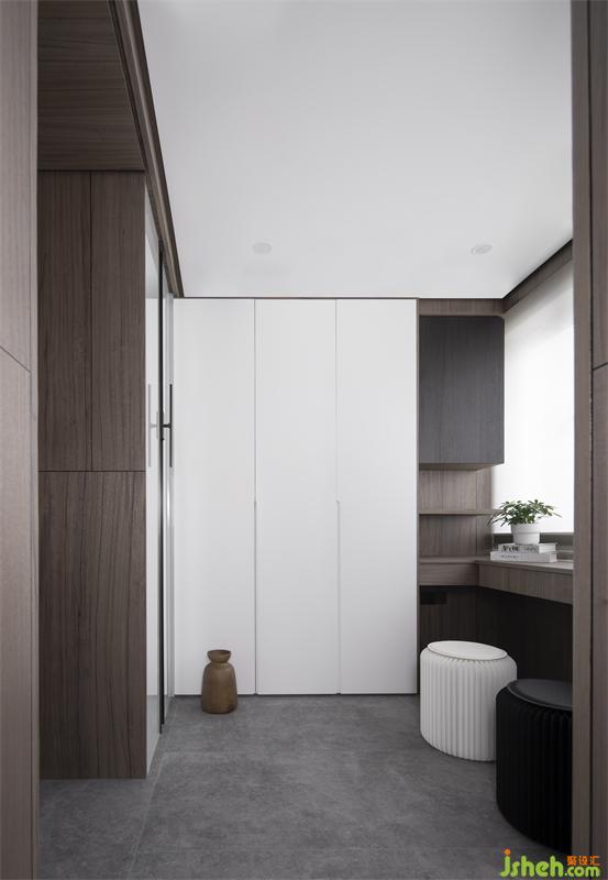 深圳家居设计将极简做到极致才有高级感,黑与白,木与钢,精致与质朴,卧室简洁的烤漆柜门一门到顶,让空间收纳最大化,搭配桌边黑色木饰面吊柜,相得益彰,