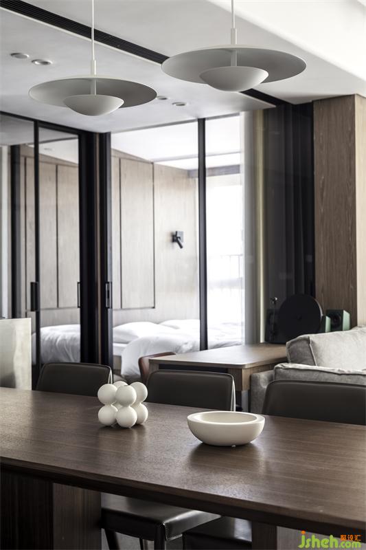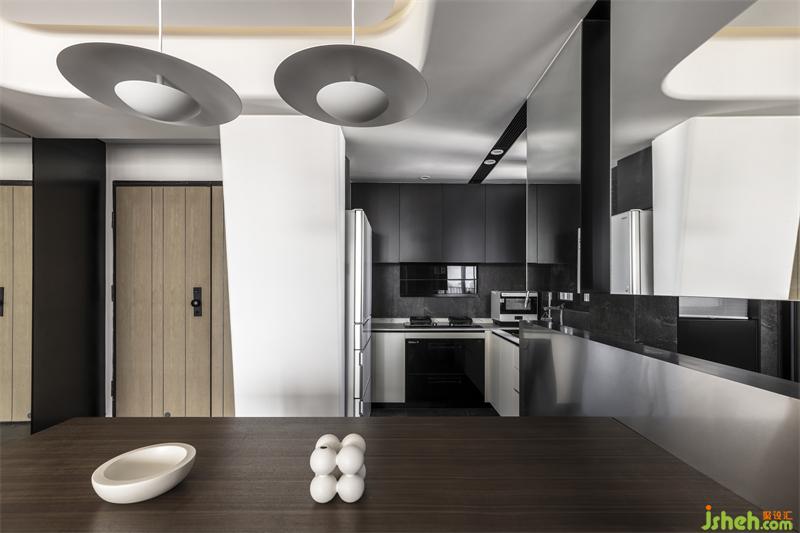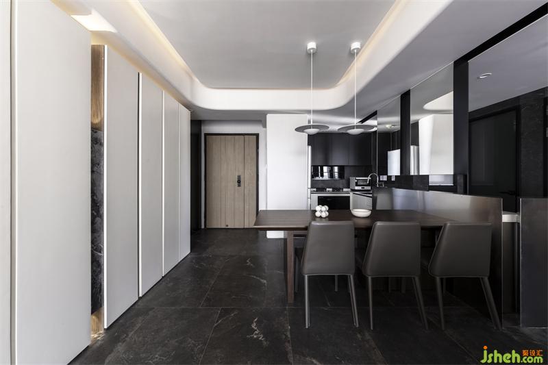 踏入餐厅,镜子引光入室营造氛围感,整体效果呈现一个深色炫酷的空间,展示了一系列令人惊讶的纹理和创意。